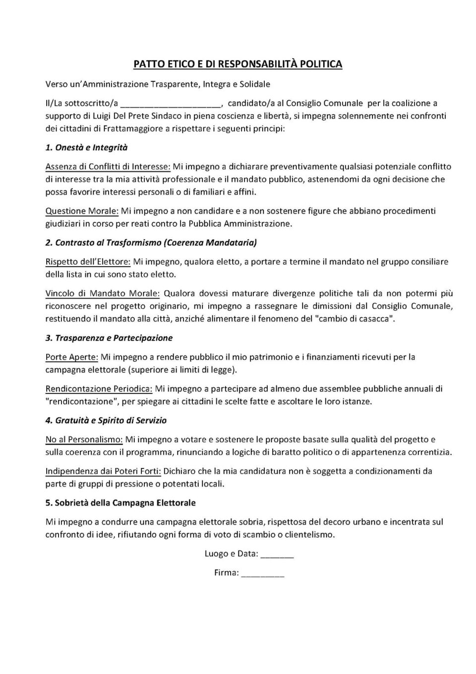 Oggi compiamo un passo ulteriore, un passo che non tutte le realtà politiche hanno il coraggio di fare: chiediamo a tutti i candidati delle liste della nostra coalizione di sottoscrivere un Patto Etico e di Responsabilità Politica.